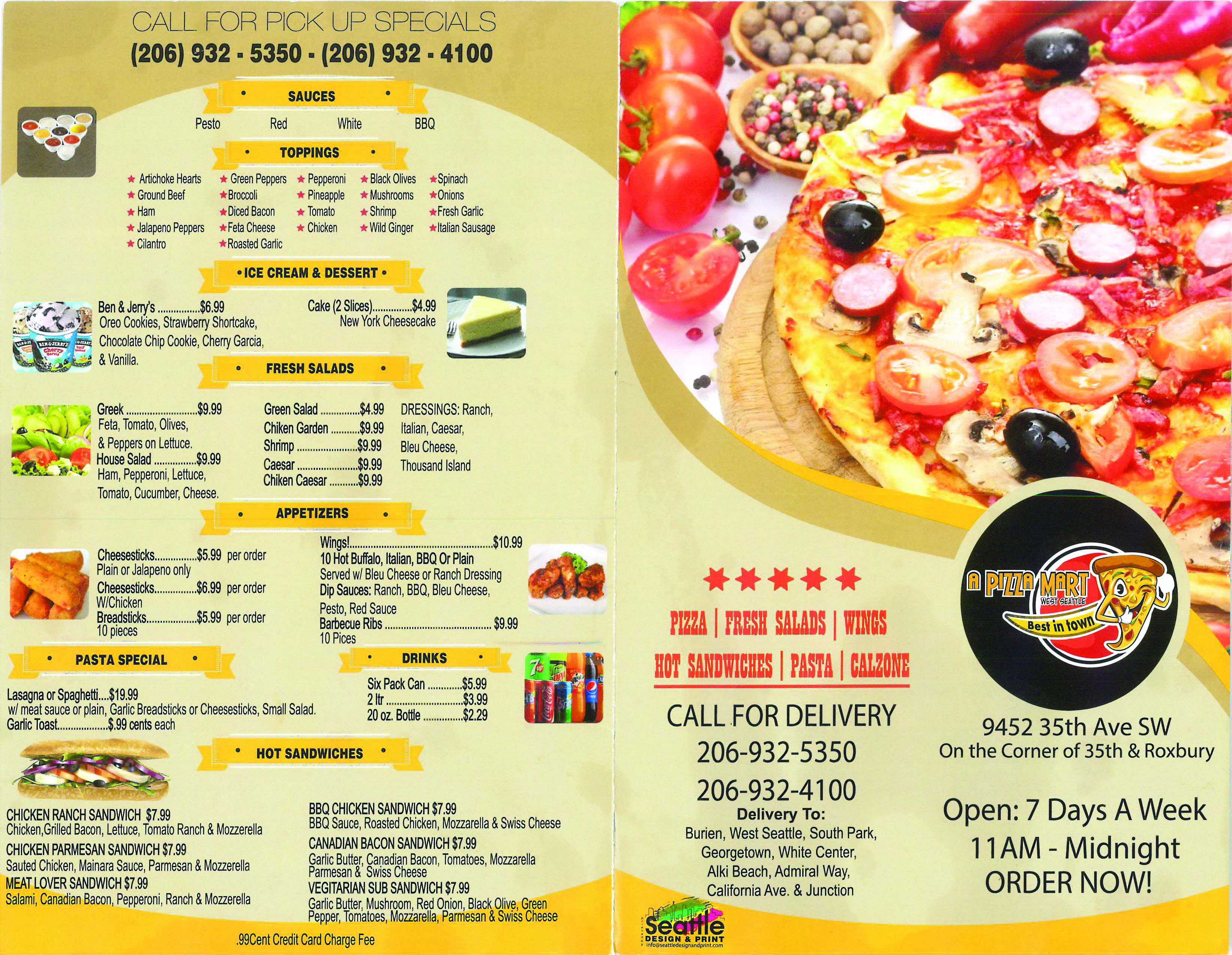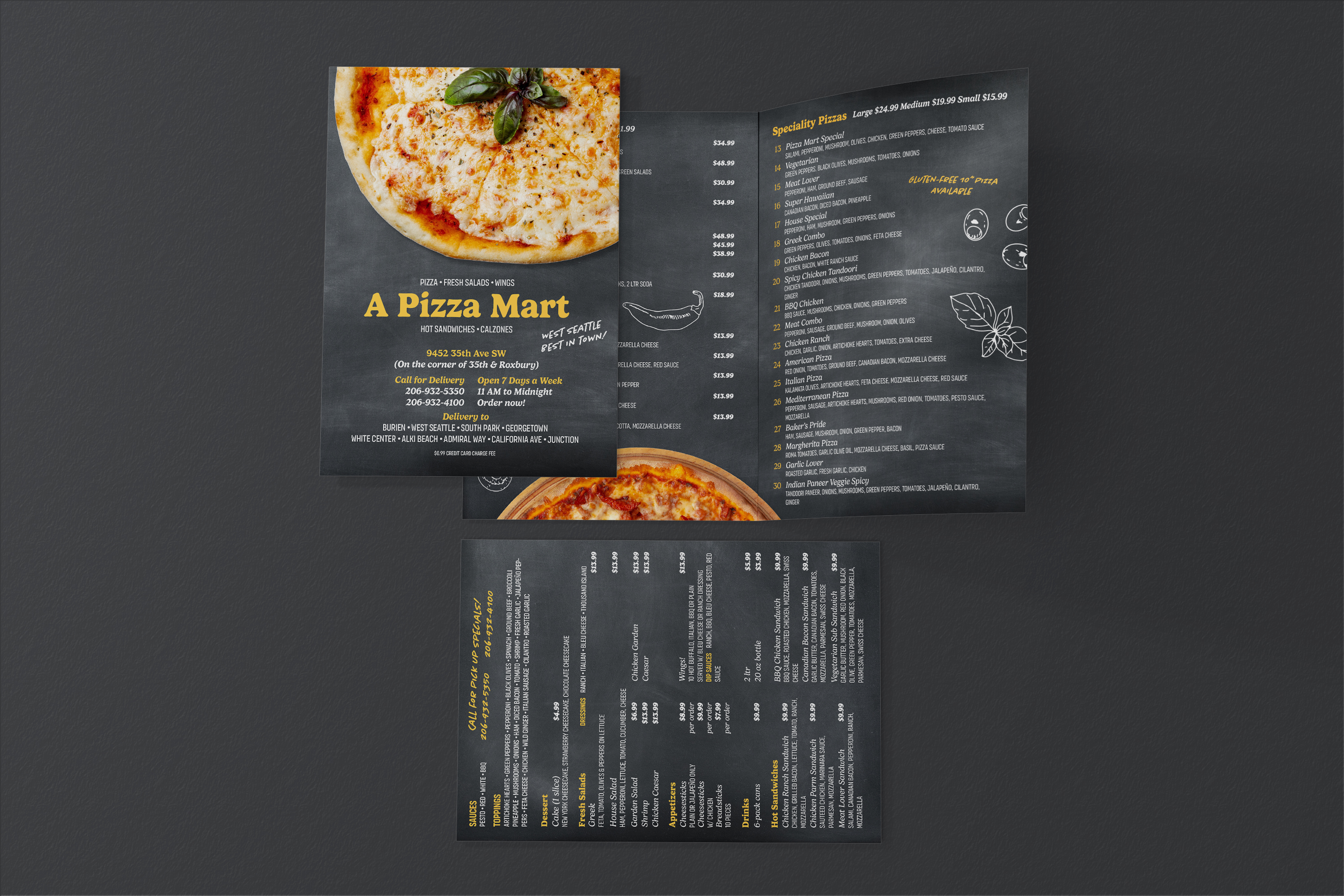 A Pizza Mart came to me with a problem that a lot of small restaurants face: their takeout menu just wasn’t doing their food justice. This local American-style pizza joint’s existing menu was cramped, generic-looking, and honestly not very appetizing. The food photos were tiny and didn’t make you want to order anything. I knew I could help them present their extensive offerings in a way that would actually make people hungry.